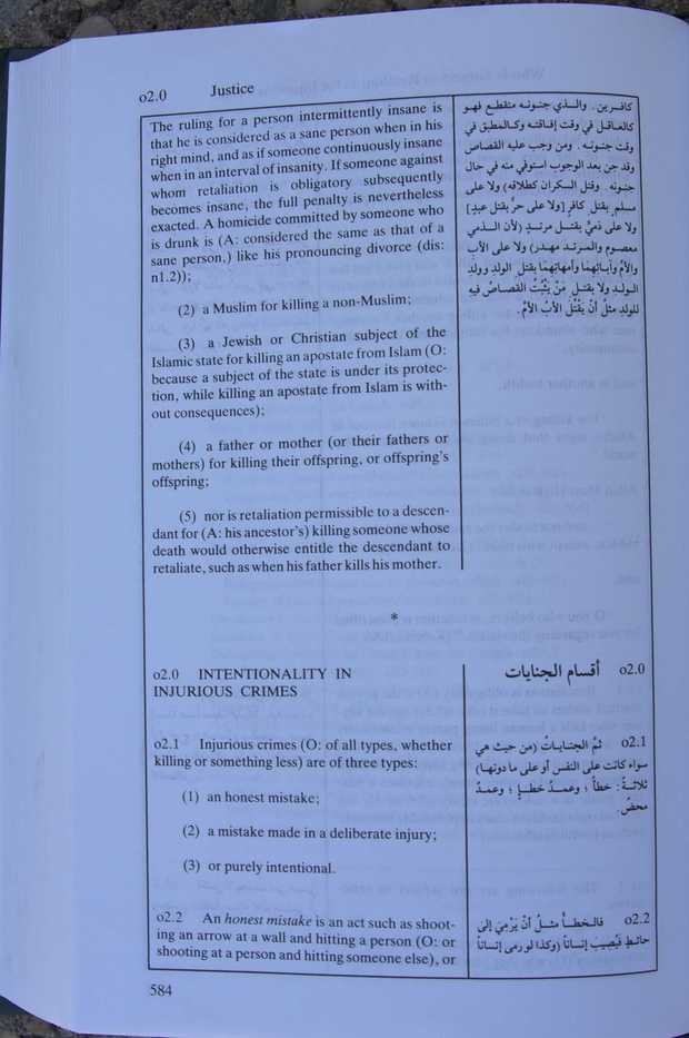 Book O, titled “Justice,” in section 1: এখনে দেখা যাচ্ছে, “Who is Subject to Retaliation for Injurious Crimes,”. section 01.1-এ লেখা: “Retaliation is obligatory … against anyone who kills a human being purely intentionally and without right…”. পড়ে ইসলামের প্রতি শ্রদ্ধায় মাথা অবনত হয়ে আসে।
